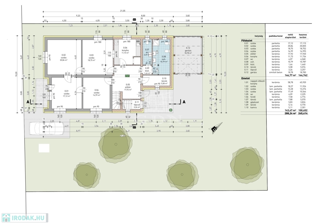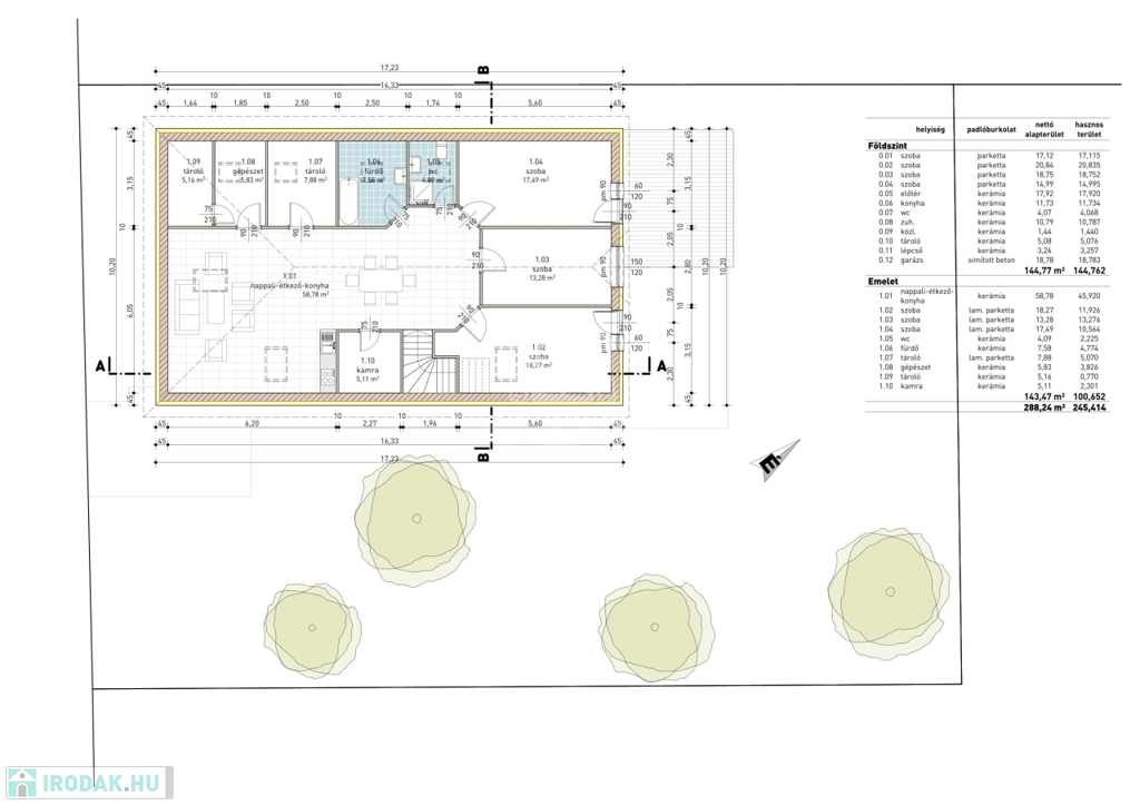A két ingatlan úgy oszlik meg, hogy a földszinten van 144 nm hasznos lakótér és az emeleten pedig 101 nm.