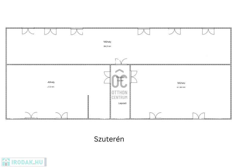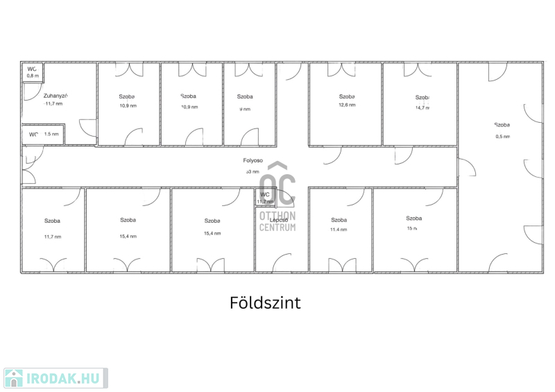 Az épület földszinti része 234 m², 10 irodával, mellékhelyiségekkel és tágas folyosóval.