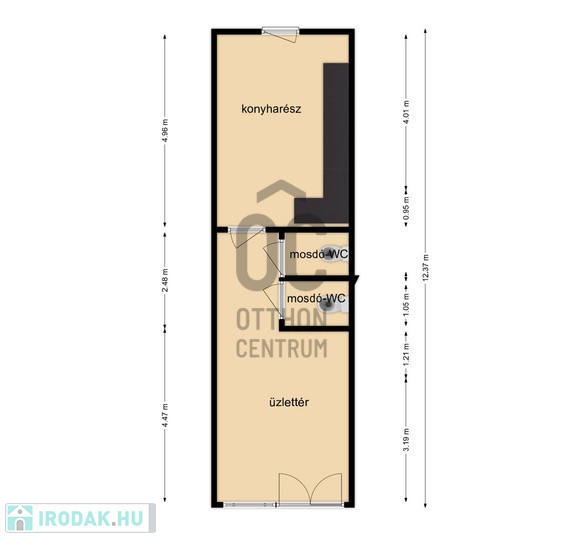 Tulajdoni lapon is üzlethelyiségként nyilvántarott helyiség, rendelkezik 2 db WC-mosdó helyiséggel, ipari árammal,