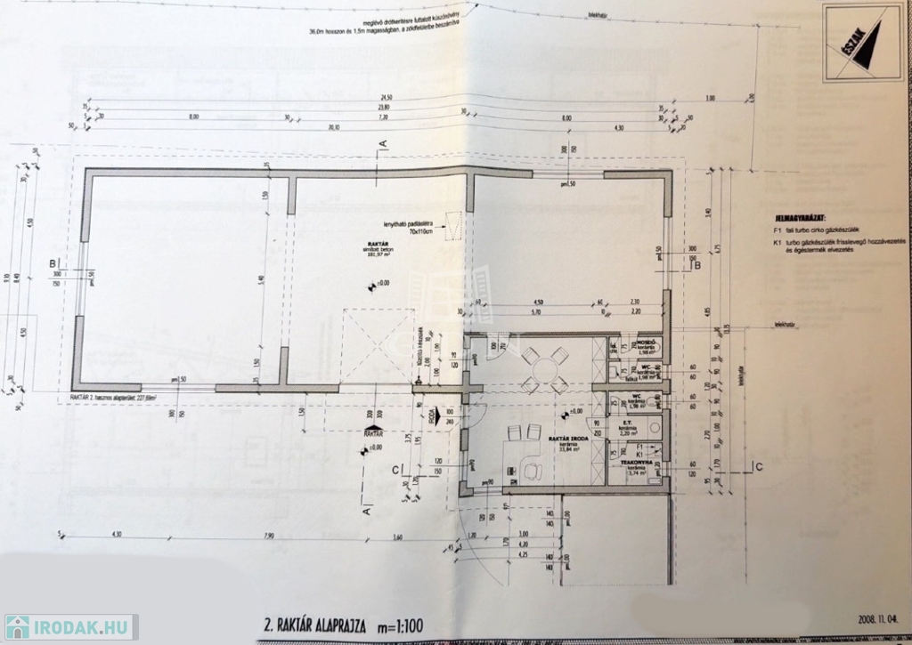 A raktárakhoz kapcsolódó teakonyha, mosdók, előtér és iroda biztosítja a napi működéshez szükséges háttérfunkciókat.