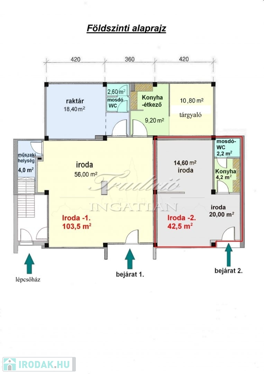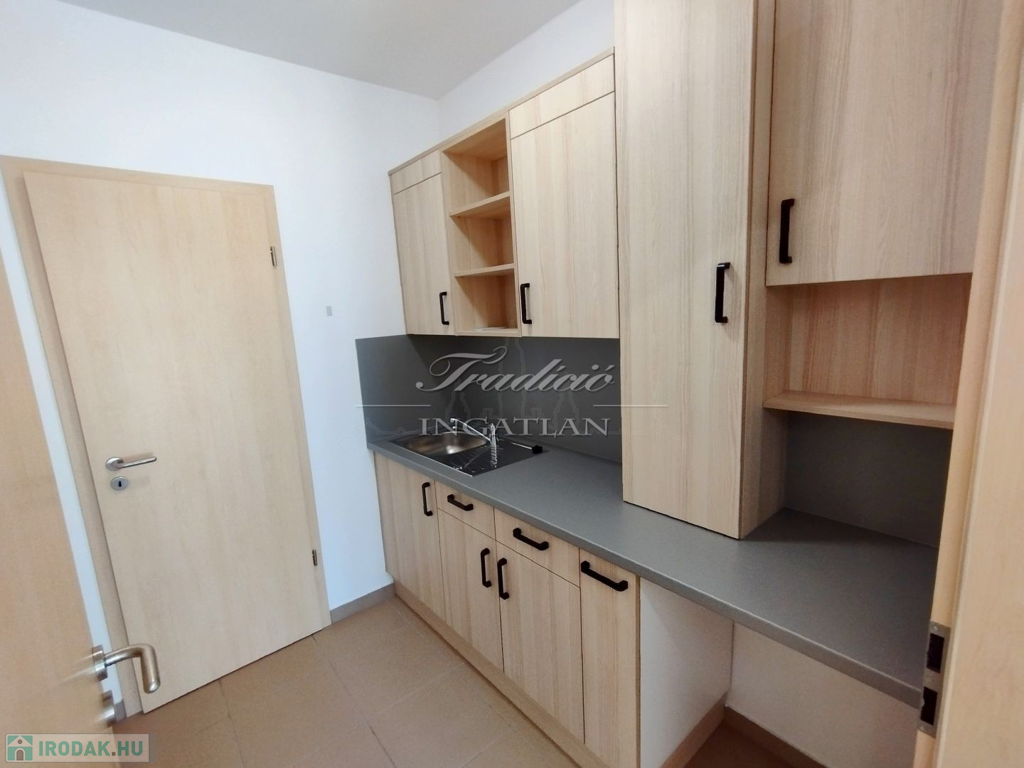 A 103,5 m2-es iroda elrendezése végett akár üzletnek, bemutatóteremnek is alkalmas lehet. A több helyiségből álló ingatlanban étkező-konyha, raktár, tárgyaló és vizesblokk is kialakításra került.