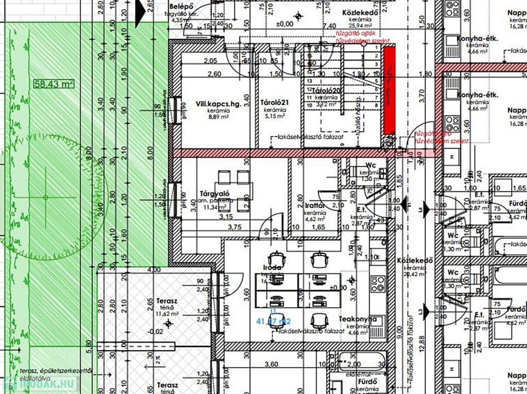 A 41,07 m2-es, I1 földszinti iroda helyiségei: iroda teakonyhával, 1 tárgyaló, 1 irattár, WC, tágas előszoba. Az irodához tartozik egy 11,62 m2-es terasz és 58,63 m2 saját KERT.