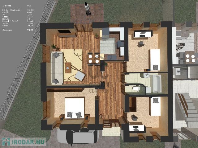 A telek területe 878 nm. A meglévő épület 278 nm. A lakások nettó alap területe :1.lakás-59,96 nm, 2.lakás :59,12 nm,3.lakás: 58,56 nm ,4.lakás: 59,98 nm. Mindegyik lakáshoz a nettó alapterületen felül 8-9 nm terasz tartozik.