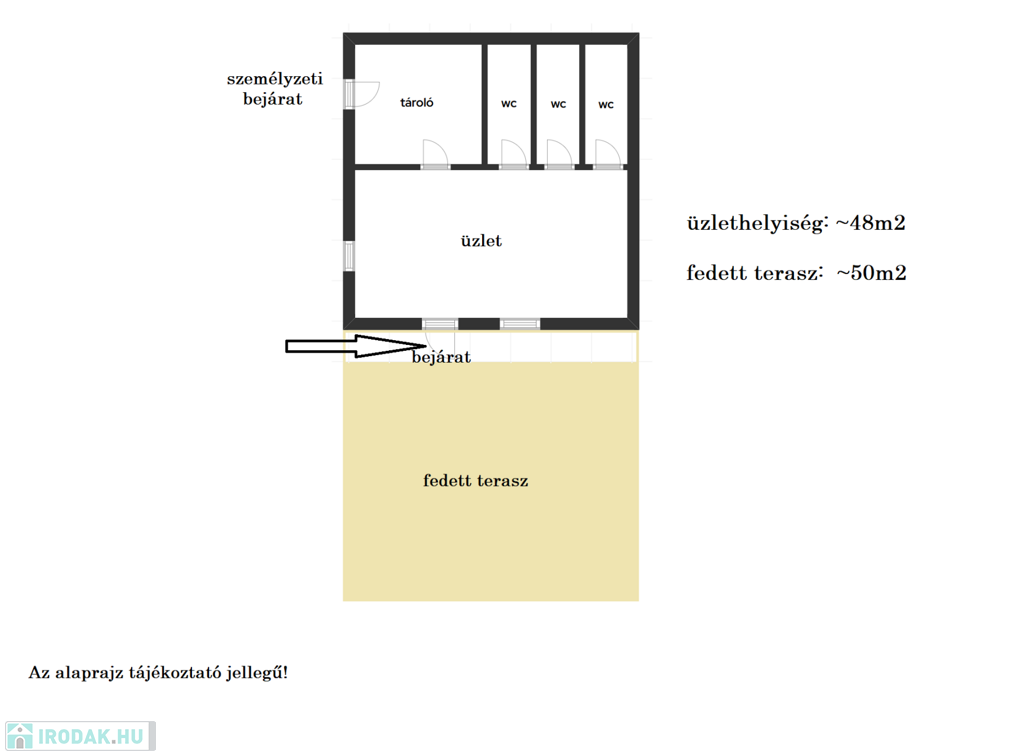 Az üzlethelyiség átlagos állapotú, mely tágas üzlettérrel, 1 személyzeti, 1 női és 1 férfi mosdóval, valamint 1 raktár helyiséggel rendelkezik. A kellemes környezetet egy közel 50m2-es terasz teszi teljessé, ahol akár vendégeit is fogadhatja, vagy kollégáival tarthat inspiráló megbeszéléseket.