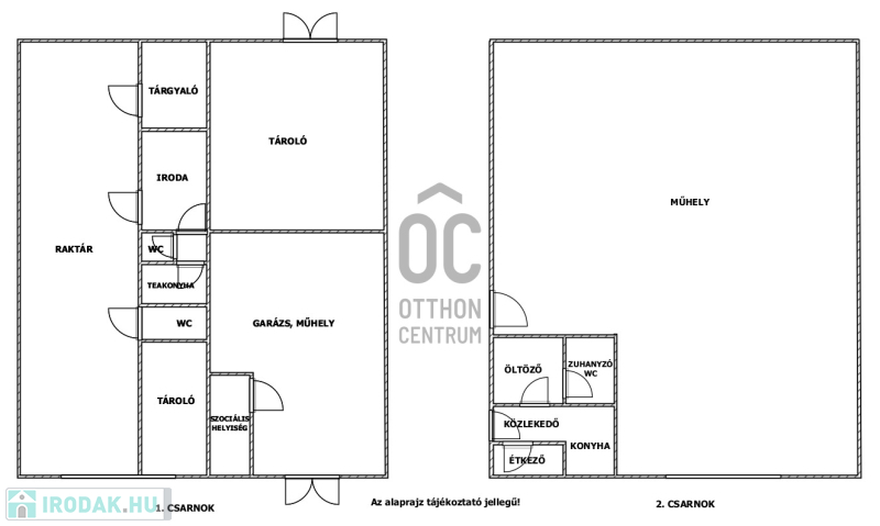 - Helyiségek: iroda, tárgyaló, szociális blokkok, zuhanyzó, teakonyha, raktár, műhely, tároló