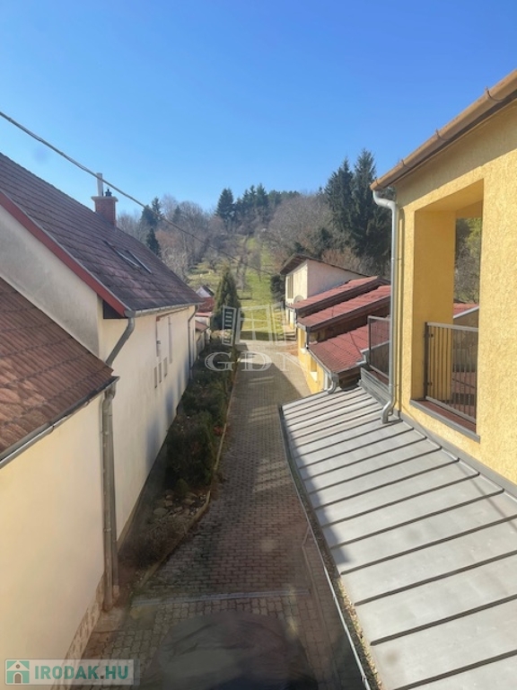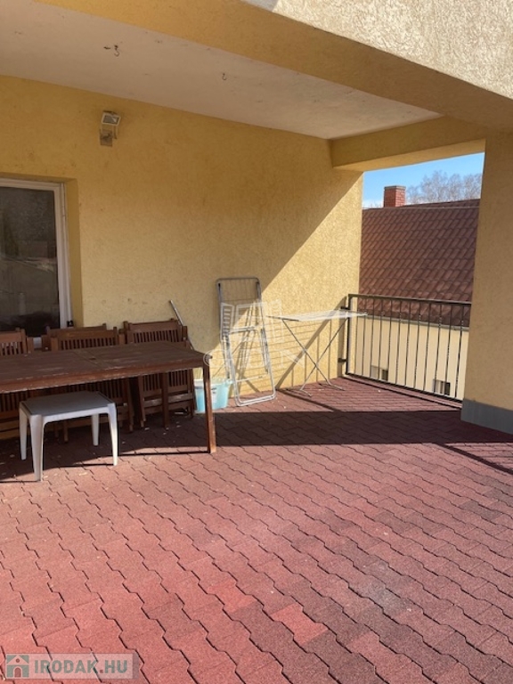 Az emeleti szint a korábbi fogtechnikai labor funkcióját időközben kinőtte ezért egy lakássá alakították át. Központi helyét a konyha foglalja el, innen nyílik 2 szoba, fürdőszoba, egy tágas, félig fedett terasz, mely étkezésekre, pihenésre is remek hely, nyitott részén pedig akár napozni is lehet. Lényegében egy külön bejáratú önálló lakásként használható de szükség esetén az eredeti fogtechnikai labor funkciója is visszaállítható.