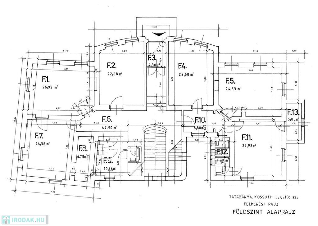 Földszint: 20–27 m²-es irodák, tárgyalók, közlekedők, szociális blokkok