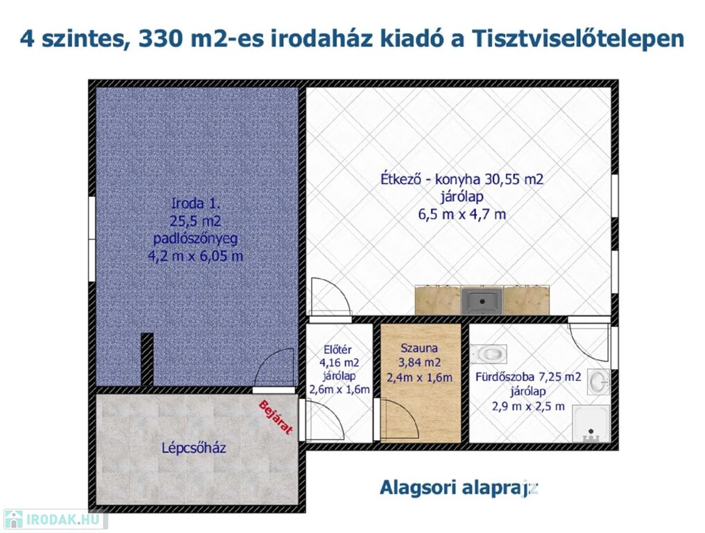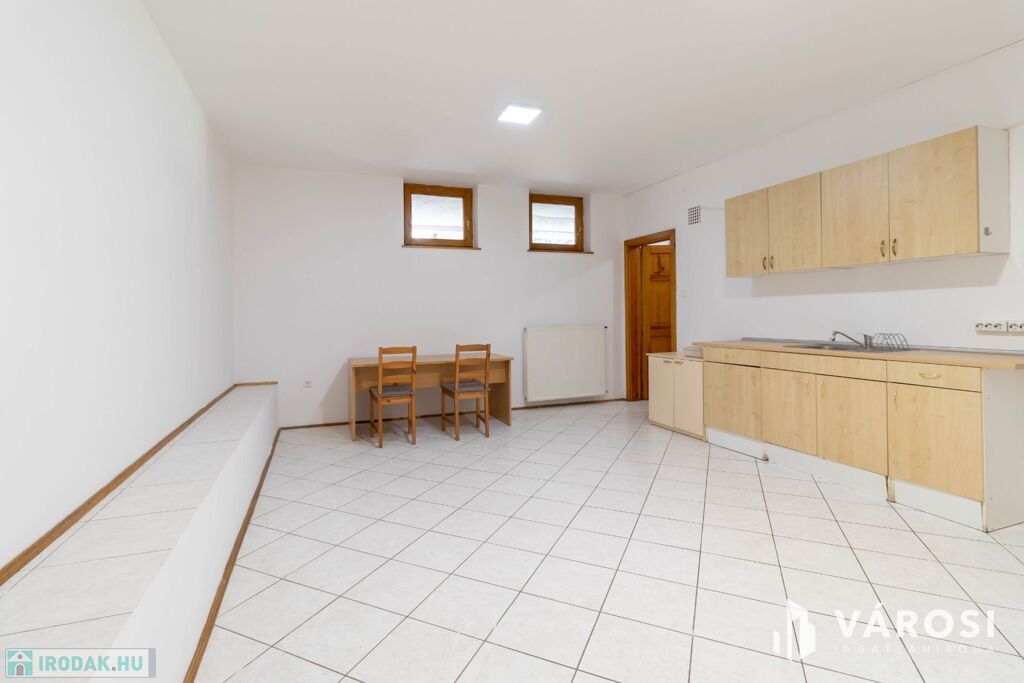 Az alagsorban tágas étkező-konyha áll rendelkezésre, amely akár 9. irodaként is használható, sőt a szauna is beüzemelhető.