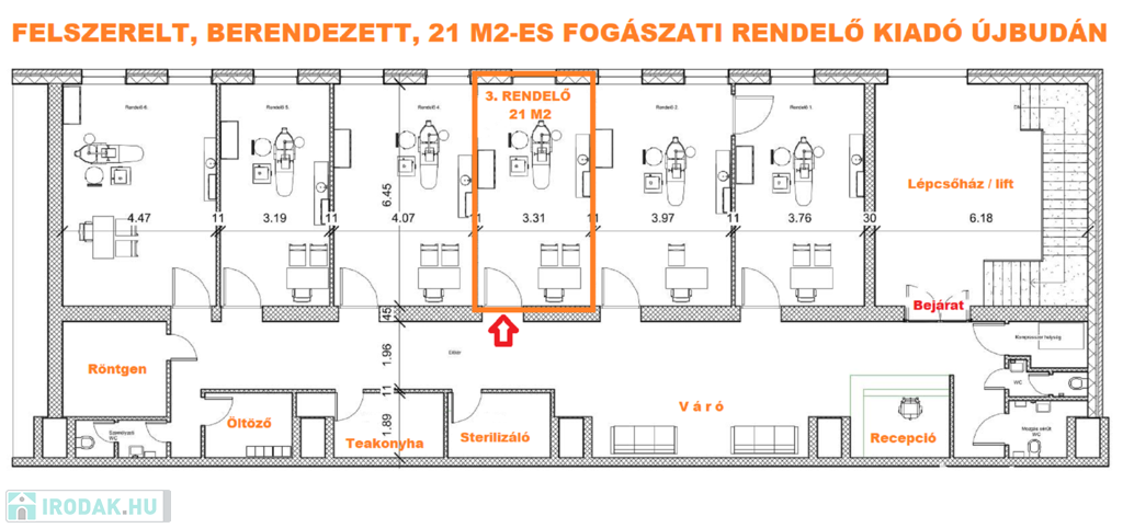 A komplexumban egymás mellett 6 rendelő kiadó, ez a rendelő 21 m2 alapterületű, teljesen felszerelt, Optimal 09 kezelőegységgel, fogászati eszközökkel és rendelői bútorzattal ellátott.