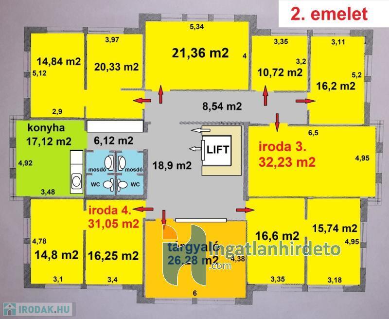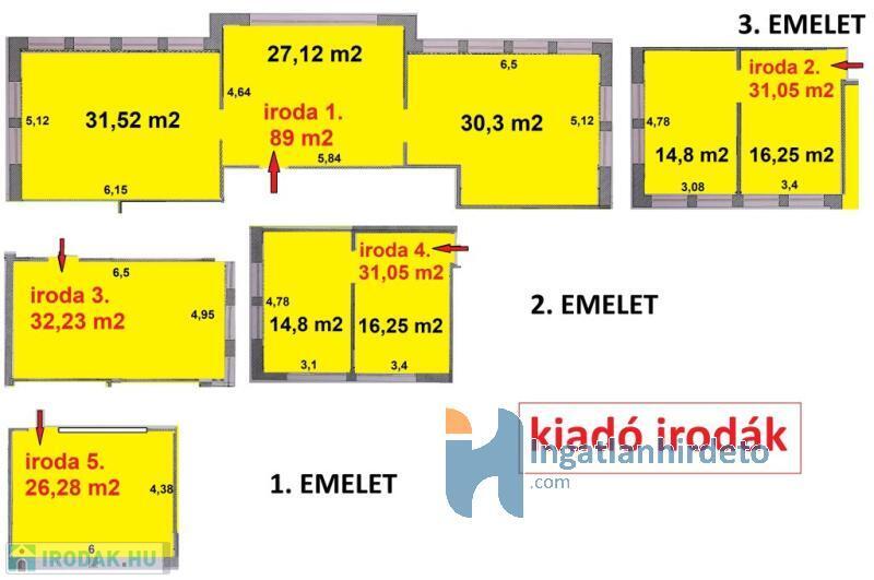 Irodák 27 m2-től 90 m2-ig bérelhetőek.