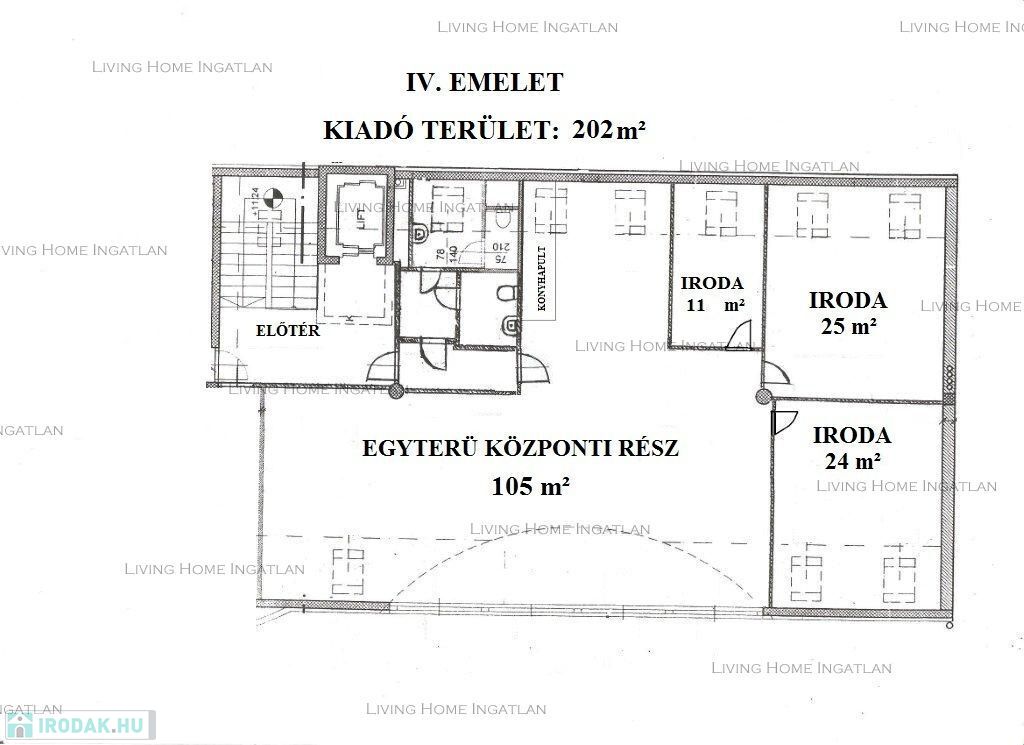 A teljes szinten belül egy vagy több iroda is bérelhető: 60 m2, 130 m2, 166 m2, 202 m2 terület.
