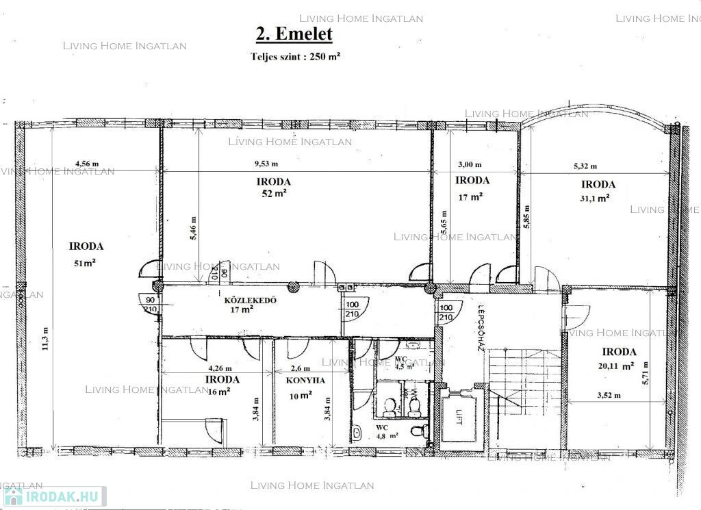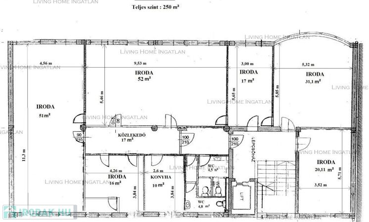 13. Röppentyű utcában 250 nm területen (lásd. alaprajz - tárgyaló, irodák, konyha és szociális helyiségek) légkondicionált iroda bérlésére nyílik lehetőség 2026 június 1-től.