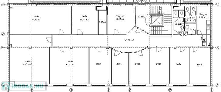 Jelenleg a szinten 11 külön,- a folyosóról nyíló iroda,- 1 db 12 fős befogadóképességű tárgyaló,- férfi és női mosdó és teakonyha található.
