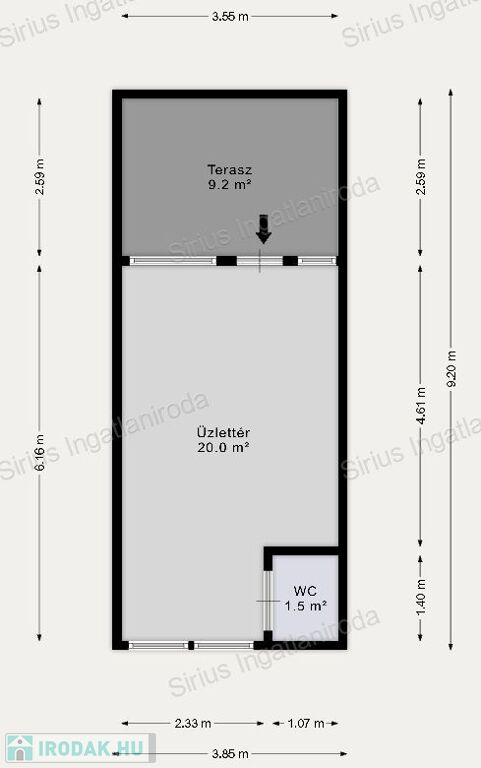 Az üzlet előtti rész díjmentesen használható, akár kialakítható egy 9 nm nagyságú terasz rész is.