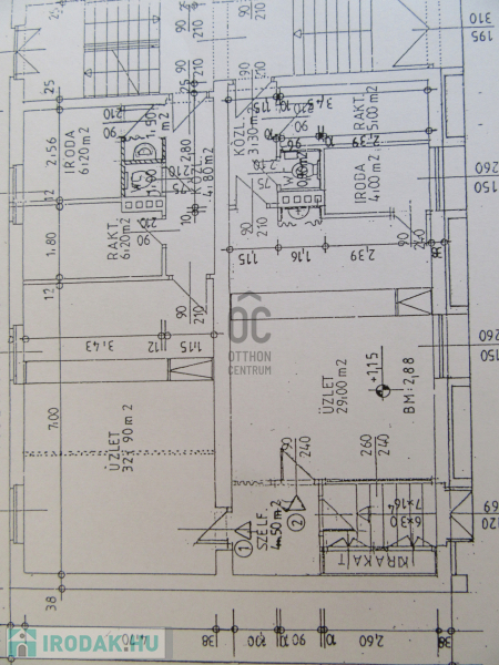 A kb tíz méter utcafronti kirakattal rendelkező ingatlan utcafronti üzlethelyiség része 50 nm, a fallal félig leválasztott belső része 35 nm, a raktár a mosdó-Wc-vel 15 nm. A raktárba pakolás a hátsó parkoló felőli bejáraton keresztül is megoldható.