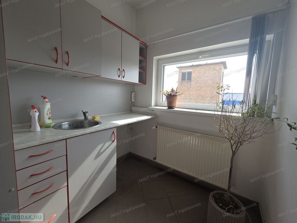 Az igényes és szép állapotú épület első emeletén az alaprajzon megjelölt irodák, egy 54 m2, és kettő 18 m2-es, közös használatú teakonyha és mosdó használattal.