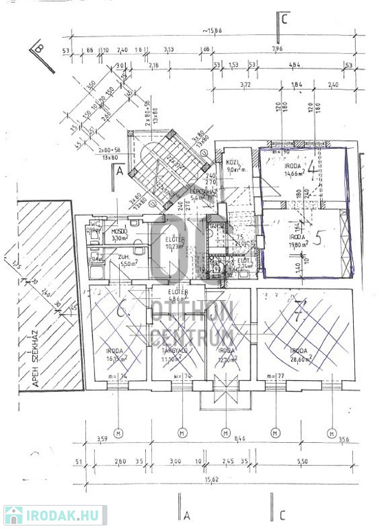 Az alaprajzon a hirdetett iroda a 4-es és 5-ös számú egyben.