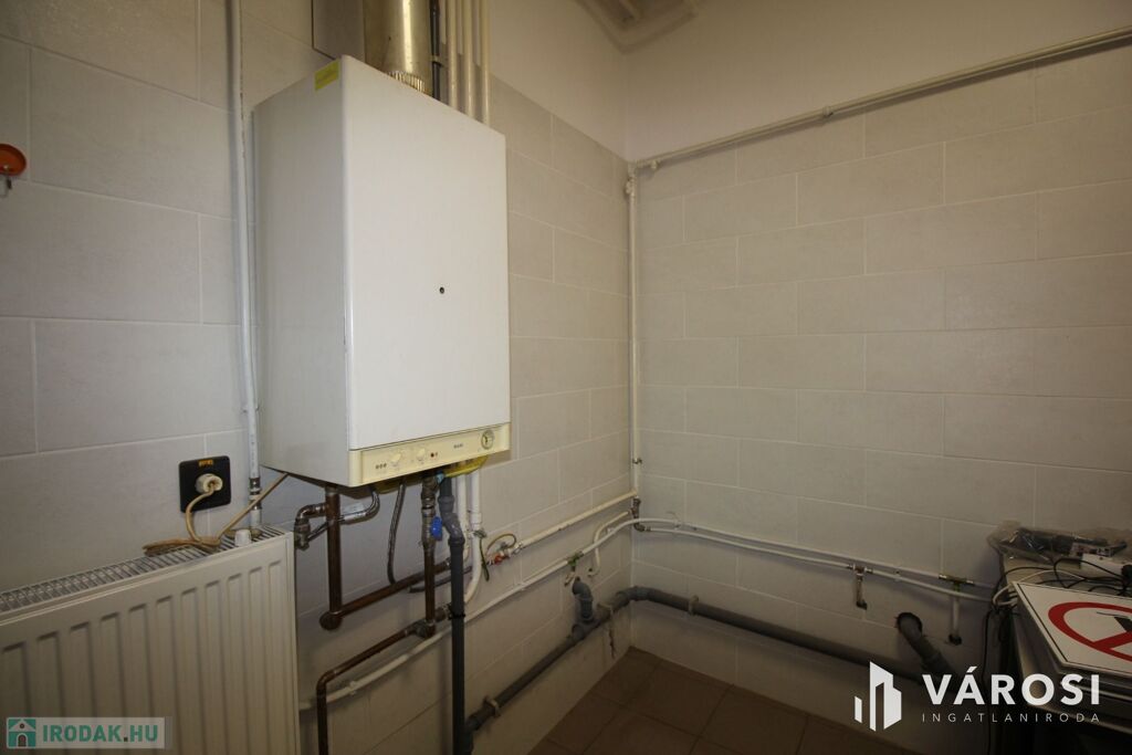 Fűtése gáz-cirkó, a melegvizet bojler biztosítja. A kirakatüvegek hungaropán üvegezésüek, így a rezsiköltség alacsony. A padozat hidegburkolat. Víz, szennyvíz csatorna bekötve. Iroda, 2 mosdó, tusoló áll rendelkezésre. Kamerával, riasztóval felszerelt ingatlan.